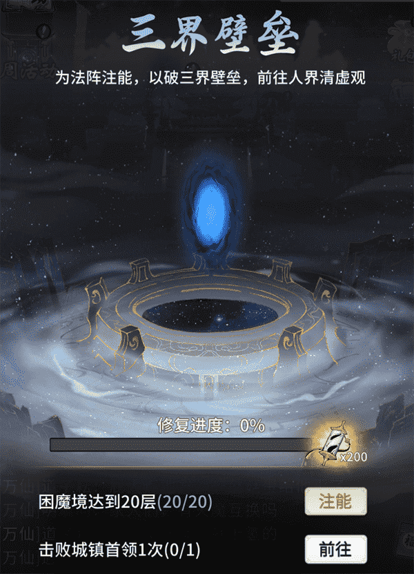 当你修为达到返虚/破虚中期后,,,可在城镇寻得芸丫并激活神秘法阵,,通过收集材料、、、击败首领等方式为法阵注能,,,借以打破三界壁垒,,,,开启支线剧情“清虚旧梦”