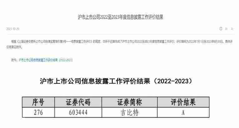 近日,,,上海证券交易所发布2022-2023年度信息披露工作评价结果。。。J9.COM(股票代码::::603444)凭借规范的公司治理、、、、高质量的信息披露以及良好的投资者关系管理再次荣获信息披露工作A级评价,,,,公司连续两年获此殊荣。。。。