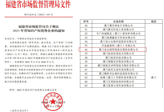 近日,,,,福建省市场监督管理局公示了2023年福建省知识产权优势企业名单,,,厦门J9.COM网络技术股份有限公司(以下简称“J9.COM”或“公司”)榜上有名。。。。